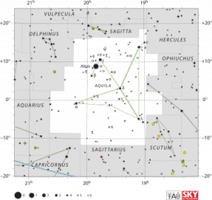 Aquila is a constellation in the northern sky. Its name is Latin for 'eagle' and it represents the bird who carried Zeus/Jupiter's thunderbolts in Greco-Roman mythology.Aquila lies just a few degrees North of the celestial equator. The alpha star, Altair, is a vertex of the Summer Triangle asterism. The constellation is best seen in the summer as it is located along the Milky Way. Because of this location along the line of our galaxy, many clusters and nebulae are found within its borders, but they are dim and there are few galaxies.